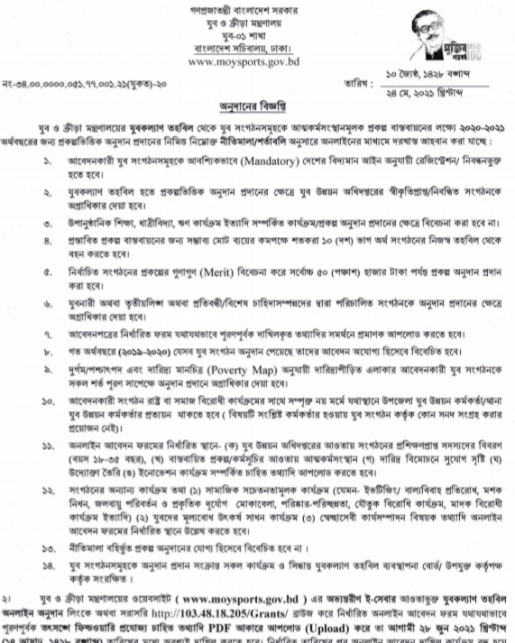 নিজস্ব প্রতিবেদক: যুব ও ক্রীড়া মন্থনালয় এর যুব উন্নয়ন অধিদপ্তর এর যুব কল্যান তহবিল থেকে আত্নকর্মসংস্থান মূলক প্রকল্প বাস্তবায়নের লক্ষ্যে ২০২০ – ২০২১ অর্থবছরের জন্য যুব সংগঠনকে প্রকল্প ভিত্তিক প্রতি বছরের ন্যায় এবারও সর্বোচ্চ ৫০,০০০ টাকা অনুদান প্রদানের লক্ষ্যে অনলাইন আবেদন আহবান করেছে। যুব ও ক্রীড়া মন্থনালয় এর ওয়েবসাইটে অথবা সরাসরি http://103.48.18.205/grants ব্রাউজ করে আবেদন করা যাবে। আবেদন করতে অবশ্যই যুব উন্নয়ন অধিদপ্তর কর্তৃক সংগঠনটির নিবন্ধন সনদ লাগবে। আবেদনটি শুরু হয় ২৪ মে ২০২১ এবং শেষ হবে ৮ জুলাই ২০২১।