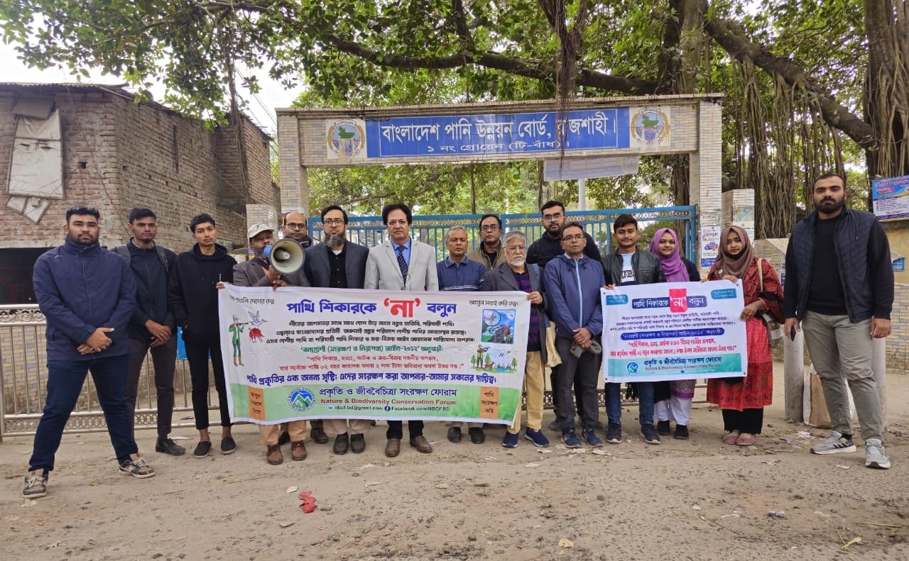 রাজশাহী প্রতিনিধি: রাজশাহীতে দেশীয় ও অতিথি পাখি শিকারের প্রতিবাদে মানববন্ধন ও সচেতনতামূলক লিফলেট বিতরণ কর্মসূচী এবং প্রশিক্ষণ কর্মশালা অনুষ্ঠিত হয়েছে। প্রকৃতি ও জীববৈচিত্র্য সংরক্ষণ ফোরামের আয়োজনে অদ্য শনিবার সকাল ১০ ঘটিকায় পদ্মার তীরবর্তী ‘টি-বাঁধ’ ও পার্শ্ববর্তী শ্রীরামপুর এলাকায় পালিত হয় উক্ত সচেতনতামূলক কর্মসূচীটি। এতে রাজশাহীর পরিবেশবাদী সংগঠনসমূহের স্বেচ্ছাসেবীগণ অংশগ্রহণ করেন। এর আগে পদ্মাপাড়ের পার্শ্ববর্তী গুরুত্বপূর্ণ স্থানসমূহে পাখি শিকার রোধে সচেতনতামূলক ব্যানার ও ফেস্টুন টাঙানো হয়। উল্লেখ্য, শীতের আগমনে রাজশাহীর বিভিন্ন এলাকায় আসতে শুরু করেছে অতিথি পাখি। সেই সাথে বেড়েছে পাখি শিকারীর দৌরাত্মও। এর প্রেক্ষিতে জনসচেতনতা ও জনসম্পৃক্ততা সৃষ্টির লক্ষ্যেই আয়োজন করা হয় উক্ত কর্মসূচীর।